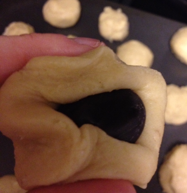 5. Take a chilled ball of dough and flatten in the palm of your hand. Put 2 mints back-to-back in the center of the dough and wrap the dough around the mints. Top each ball with a walnut, if desired.