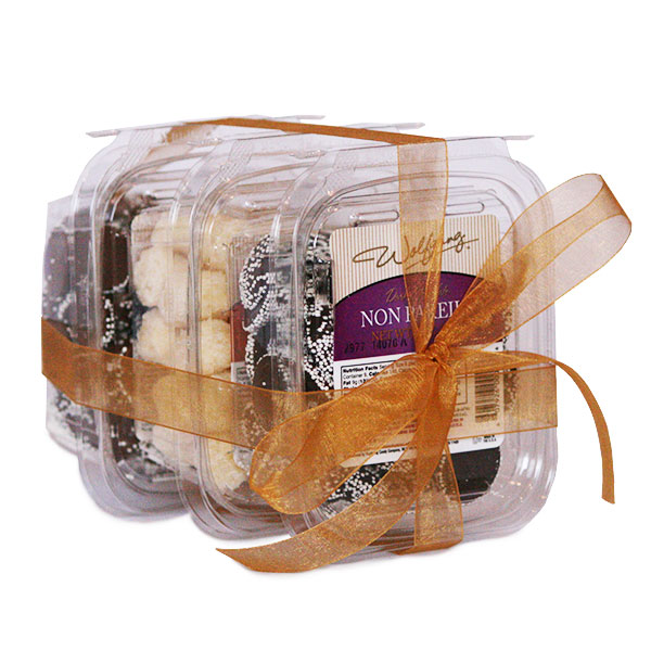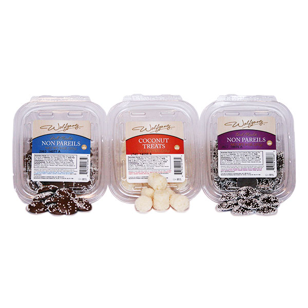This tower is the perfect combination of 9 oz of our Milk Chocolate NonPareils, 9 oz of our sweet rolled coconut dusted in snowy white sugar, and 9 oz of Dark Chocolate with delicate white candy beads NonPareils. Perfect for every party or office event. A treat to please everyone!